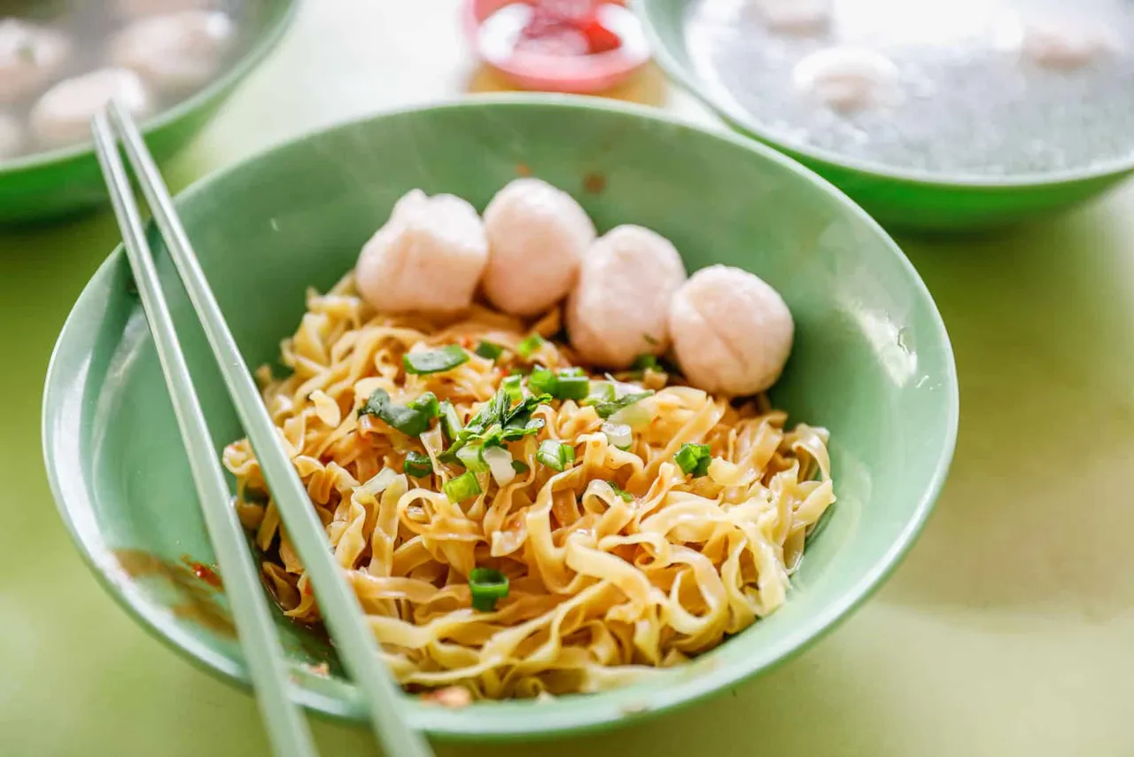 Fishball noodles is a pretty standard hawker dish but one that can be overlooked by non-locals. It's a Teowchew recipe that typically consists of flat yellow noodles (colloquially known as mee pok) mixed with a special blend of sweet sauce, chili sauce/ketchup and topped with sliced fishcakes, fishballs and sometimes minced pork or fried lard.