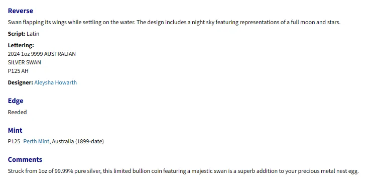 - Reverse: Portrays a swan flapping its wings while settling on the water. The design includes the night sky featuring representations of a full moon and stars. The design includes an inscription, "The 1 oz 9999 Australian Silver Swan," along with the 2024 year-date and The Perth Mint's "P125" mint mark signifying The Perth Mint's 125th anniversary.