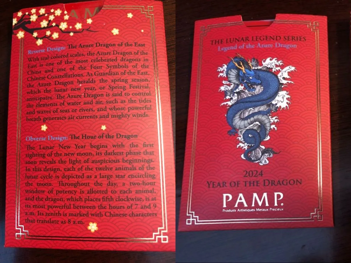 The Azure dragon is portrayed by PAMP in the reverse field of the 2024 PAMP Suisse Lunar Legend Azure Dragon Silver Bars. The Azure Dragon is linked to many fortunate qualities in Chinese culture, including power, strength, and good fortune. It is frequently seen as a protective symbol and is thought to promote peace and prosperity.