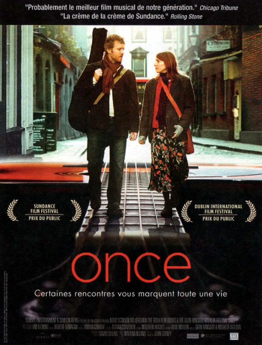 Once no es un musical en la línea de Les Miserables en los que cada diálogo es cantado, o de La La Land, con escenas de canto y de baile, sino más bien del estilo de Begin Again, porque sus protagonistas hacen música, pero sin las escenas graciosas de comedias como Music & Lyrics. Once es una historia de amor y de música, pero se trata de un drama. En ella conocemos un hombre de más de treinta y tantos años, cantante y compositor, que - guitarra en mano - interpreta canciones por las calles de Dublín, cuando no está trabajando en el taller de su padre que repara aspiradoras. Durante el día, canta canciones populares a cambio de propinas, pero por la noche canta los temas que él mismo ha compuesto y que no canta durante el día porque cree que la gente no le dará dinero a cambio de una canción que no conocen. Una noche se acerca una chica de unos veintipocos años de edad a escucharlo y le aplaude con honestidad. No deja una gran propina porque no puede, ya que como él, ella también lucha para ganarse la vida. A partir de allí se dan algunos encuentros azarosos y otros voluntarios y vamos conociendo un poco de la historia de los dos. Nos enteramos de que él está atravesando una dolorosa ruptura y que su ex se fue a Londres; de ella nos cuentan que es inmigrante, llegada desde la República Checa, que vende flores en la calle y vive con su madre. Ninguno ha tenido suerte en el amor y ambos encuentran algo de escape y consuelo en la música porque - sorpresa - ella también sabe tocar un instrumento - el piano - y le gusta cantar. Entonces, el siguiente paso lógico y natural es compartir un poco de la música de cada uno con el otro y comenzar a cantar y a tocar juntos.