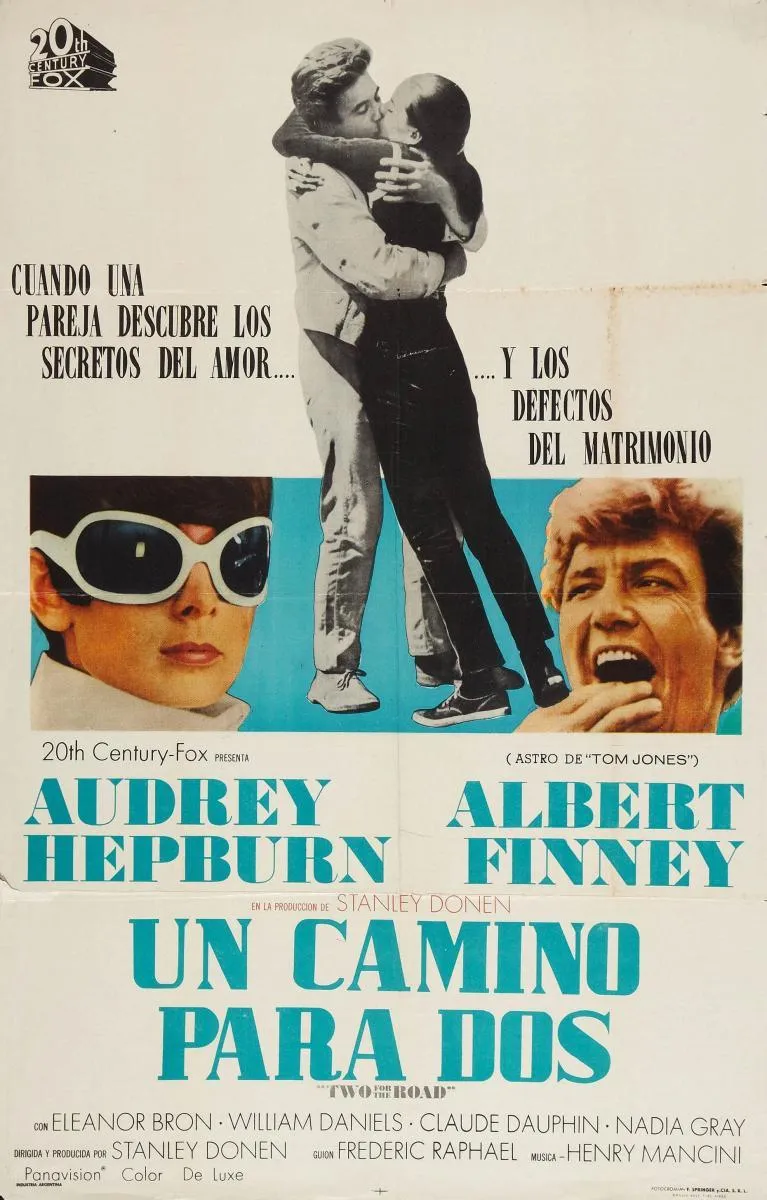 En un principio quería hacer un post sobre sus papeles más recordados o sobre mis películas favoritas de Audrey, pero ya lo he hecho antes, así que preferí pagar alguna de las deudas que tenía con ella y ver una de esas pocas películas suyas que aún no había visto. Two for the Road es un film dirigido por Stanley Donen y escrito por Frederic Raphael, protagonizado por la ya mencionada Audrey Hepburn junto a Albert Finney. En ella se relata la historia de una pareja, Mark y Joanna, desde que se conocen hasta que cumplen diez años de matrimonio. La cinta inicia con un viaje desde Londres hasta la Riviera francesa en medio del cual, los esposos desde hace bastante tiempo, recuerdan algunos de sus episodios menos amistosos mientras el guion nos lleva de atrás hacia adelante para mostrarnos las distintas etapas por las que ha pasado la pareja: el inicio romántico e ideal, la juventud perdida, los deslices de uno y otro, el matrimonio, la maternidad, el éxito profesional, los cambios en el estilo de vida que los llevó de mochileros que viajaban a dedo y comían enlatados hasta esta pareja adinerada que se codea con lo más alto de la sociedad francesa en mansiones y restaurantes costosos. El título habla de un camino (road), lo que sugiere un viaje, pero en realidad hay varios viajes que se superponen en la historia: el viaje literal por las carreteras europeas, el mediterráneo, Inglaterra, Francia y otros lugares que la pareja visita y revisita después; la vida como un viaje que nos lleva desde la juventud a la adultez; y el matrimonio como un viaje, como un recorrido que a veces puede unir más a dos personas, pero que también puede acabar separándolas.