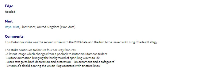 Philip Nathan's portrayal of Britannia is still featured on the reverse of 2024 British Silver Britannias from the mint. With a Corinthian helmet on her head, a trident in her right hand, and a Union Jack shield on her left, she is portrayed as a strong female metaphor looking to her right in front-facing relief.