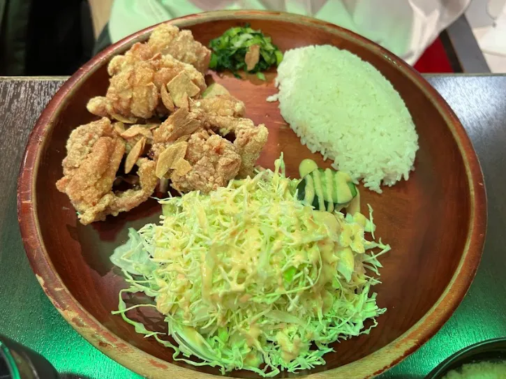 We were quite torn on which flavour karaage to try, and Sean ordered their signature karaage set which comes with 5 pieces of your choice of karaage, rice and vegetables. I think he chose the Garlic Steak Sauce chicken.