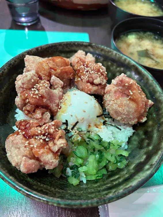 I ordered the bowl instead which comes with 5 pieces of karaage, rice, spring onions and a soft boiled egg. Both our meals also came with a bowl of miso soup.