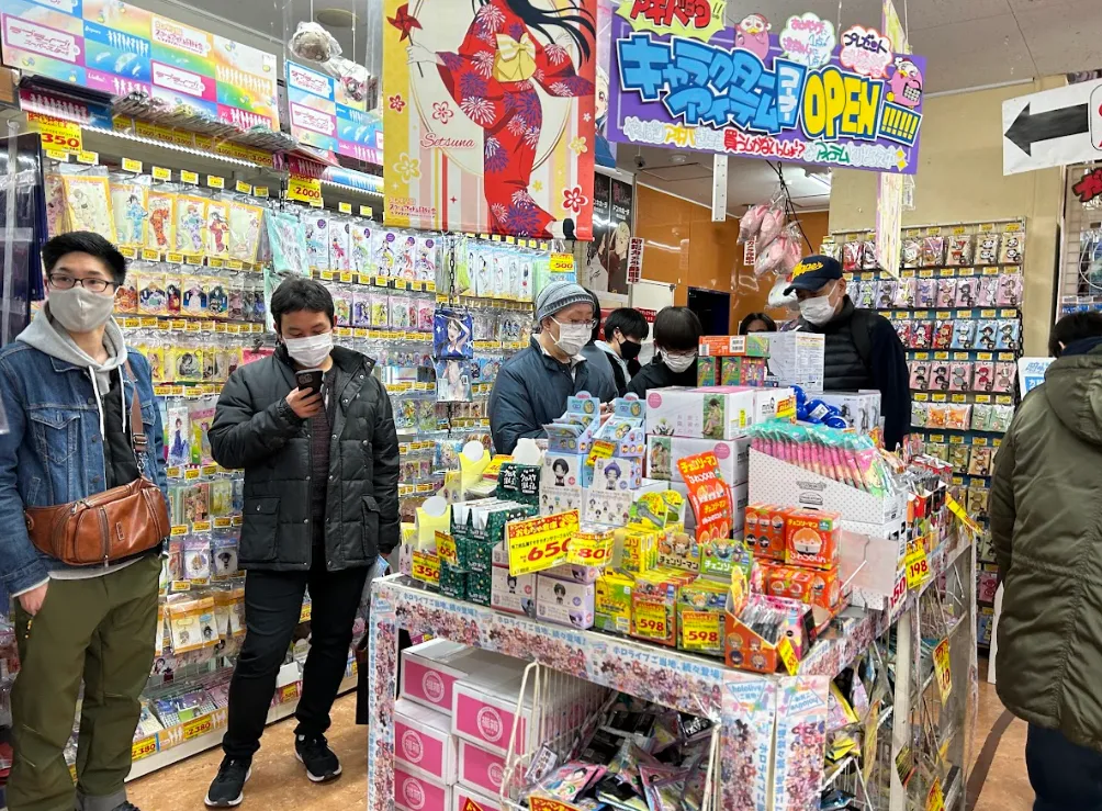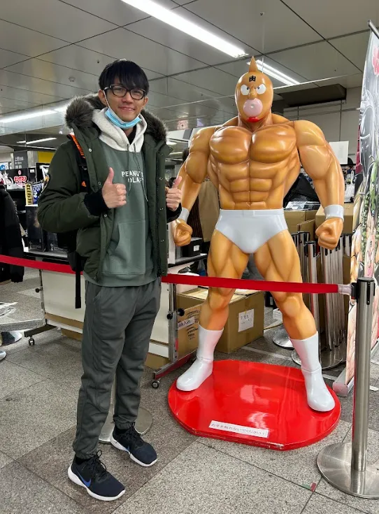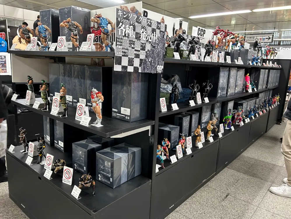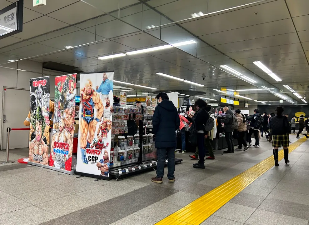 We're not even outside the station and already we saw an anime pop-up store selling merchandise for this goofy-looking anime with a very buff man.