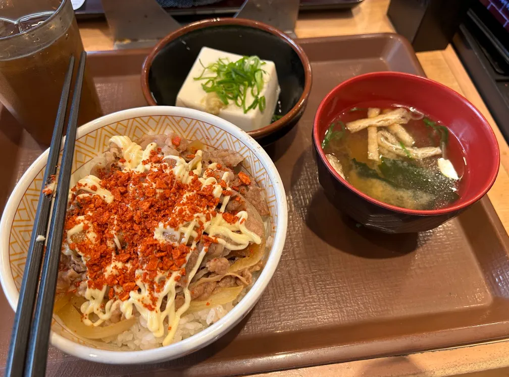 We headed to one of our classic go-to spots for cheap eats, Sukiya! Back before they expanded internationally, we'd always make it a point to eat here at least once whenever we visited Japan.