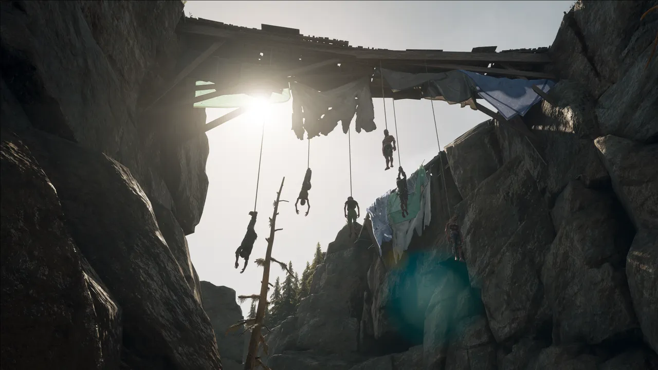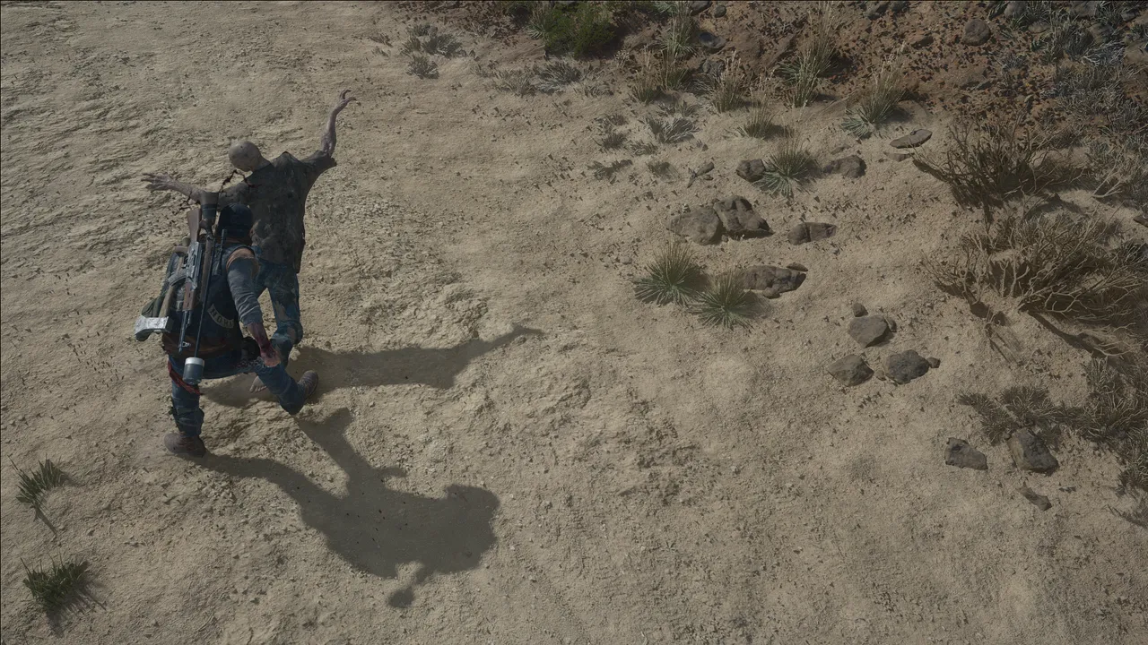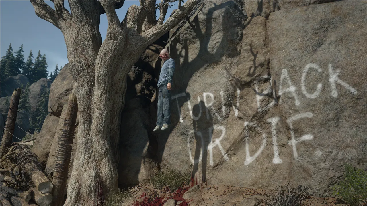 I noticed this body before but didn't notice the shadow before but now I did. The peoples of the ambush camp did this to that man and hanged him there writing "Turn back or DIE" on the rocks and you see there's this fantastic shadow.