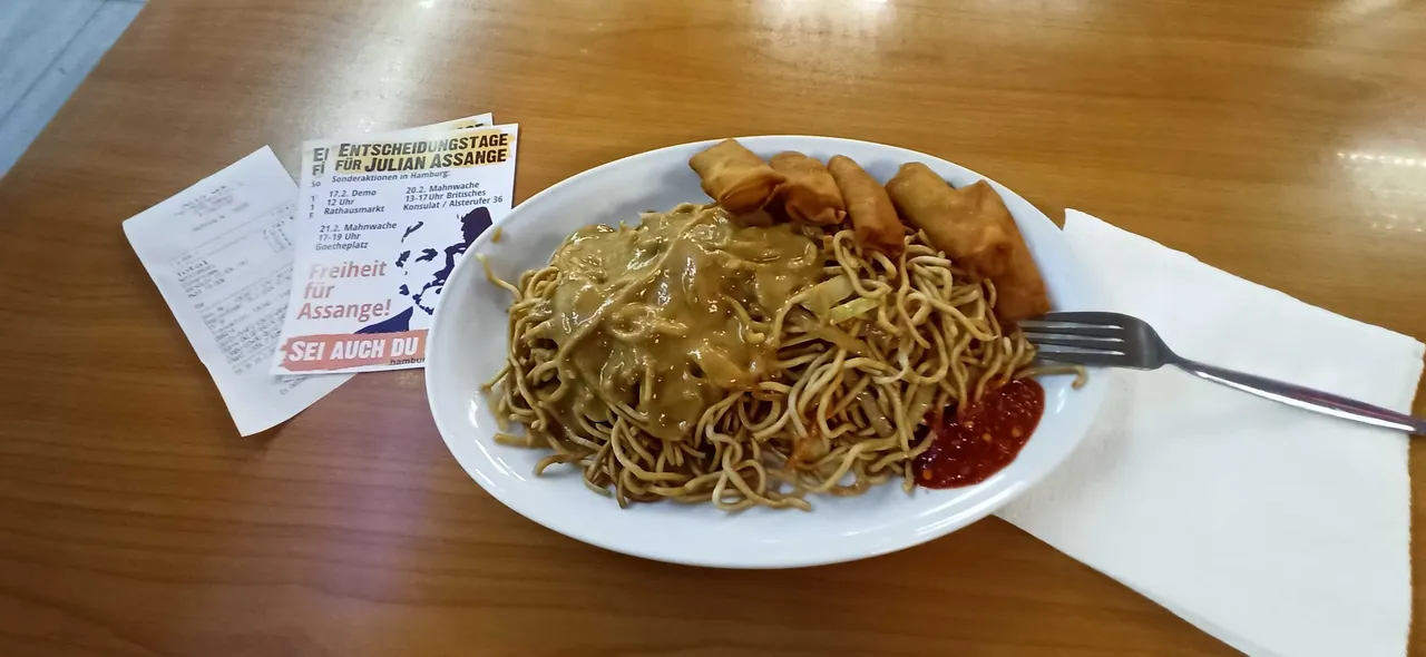 Ein Kabel erreicht zu haben, bin ich nochmal unterwegs. Im "Asia Wok" liegen heute doch Assange Flyer. Im Bahnhof prallen Kulturen aufeinander. Ich werde in Kürze wieder ins Museum.