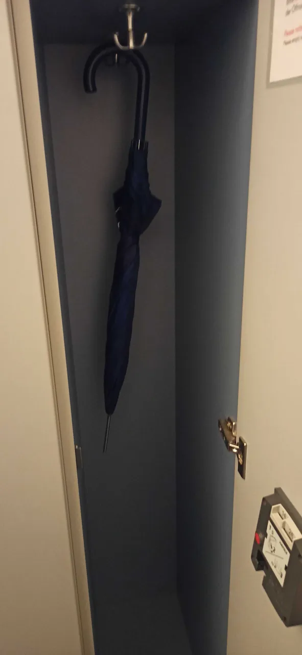 Nasse Regenschirme dürfen diesmal nicht mit in die Ausstellung, als der Andrang nachlässt und ich erwischt werde. Ich fand einen Schrank.