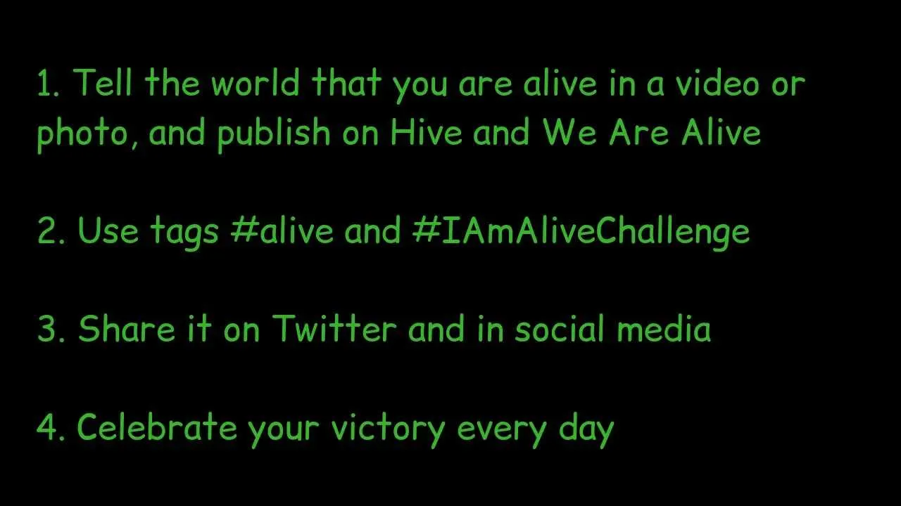 - #IAmAliveChallenge : Tell the world that you are alive in a video, photo, and publish on Hive and We Are Alive.
