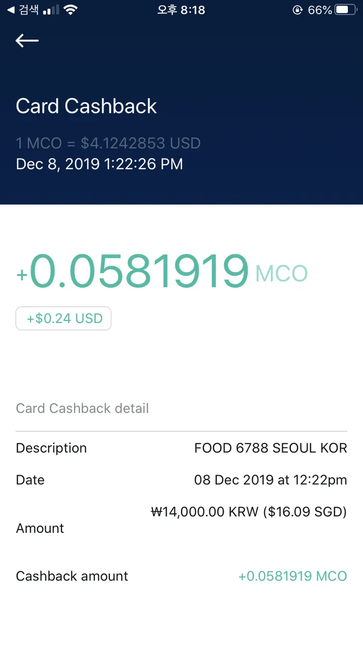 환율 어플과 대조해 표면상으로는 오늘(일요일) 서브웨이에서 결제한 1만4천에 대해 0.23% 더 비싸게 결제가 된 것 같네요. 그래도 결제가 진행되던 당시 MCO 현재가 기준으로 2%의 캐시백을 받았으므로 1.77% 이득입니다. 물론, 여기서 MCO카드에 사용했을 돈을 코인이 아닌 국내 카드(하나은행/비바+ 체크카드)를 사용하여 충전하셨다면 SGD를 구매하셨을테니 또 은행간환율로 지급받으셨을껍니다. 계산의 편의를 위해 같은 일요일인 오늘 국내카드를 통해 해외결제 수수료 없이 SGD를 MCO카드에 충전하셨다면 환율어플로 확인 되는 것보다 0.23% 불리하게 적용받으셨을테니 최종 1.54% 만 캐시백 혜택을 받으실 것 같아요.