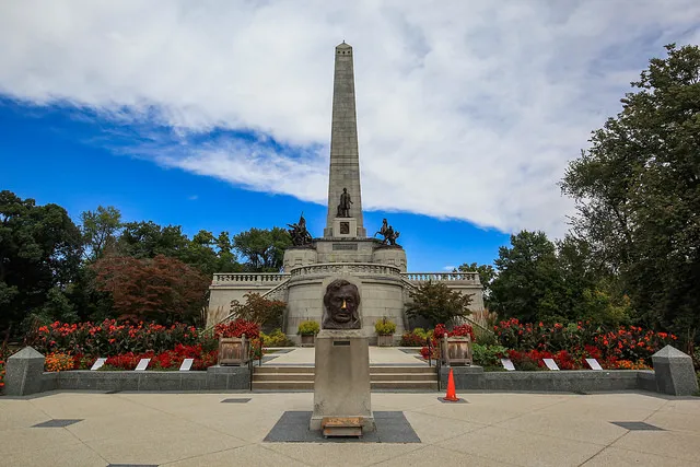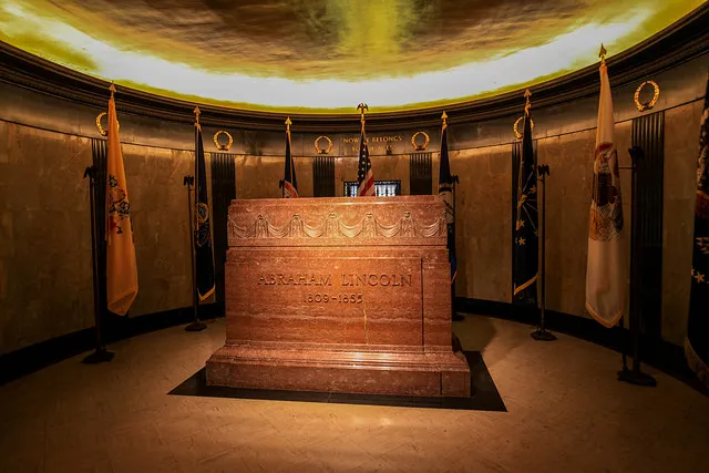 9: Lincoln's Tomb at Oak Ridge Cemetery. A bronze bust sits outside, it's nose polished to a bright sheen due to the custom of visitors rubbing it for good luck. He was interred here in when construction was completed in 1874, 9 years after his assassination in 1865.