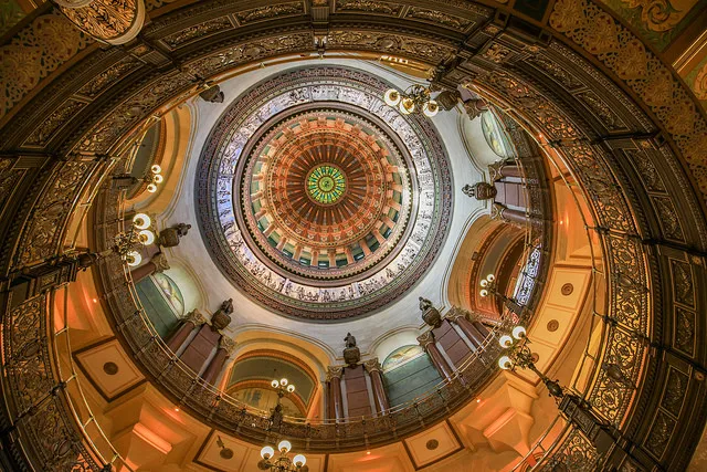 3: Stained glass on the interior of the dome provides soft lighting to the rotundas on all floors. Lower down, a plaster frieze and bronze statues celebrate heroes and events from the past.