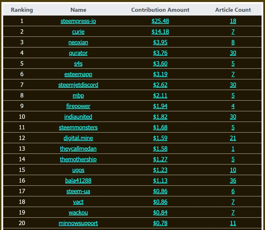Last month when I was preparing the stats report, steemfriends.org website was not available by then. And it looks like the website is now back again. Thanks to the creator. Compared to the last month, it looks like my rewards have reduced and the number of curators on my post have reduced. I did learn a lesson in the previous month about the importance of manual curation. If I continue to do manual curation, people do that back to me and upvote my posts. Below are the top contributors on my post in the last month.
