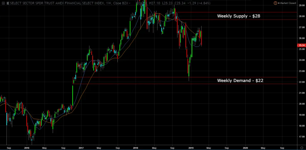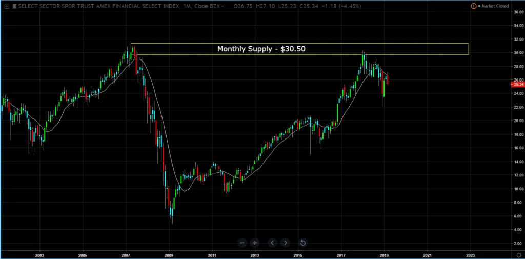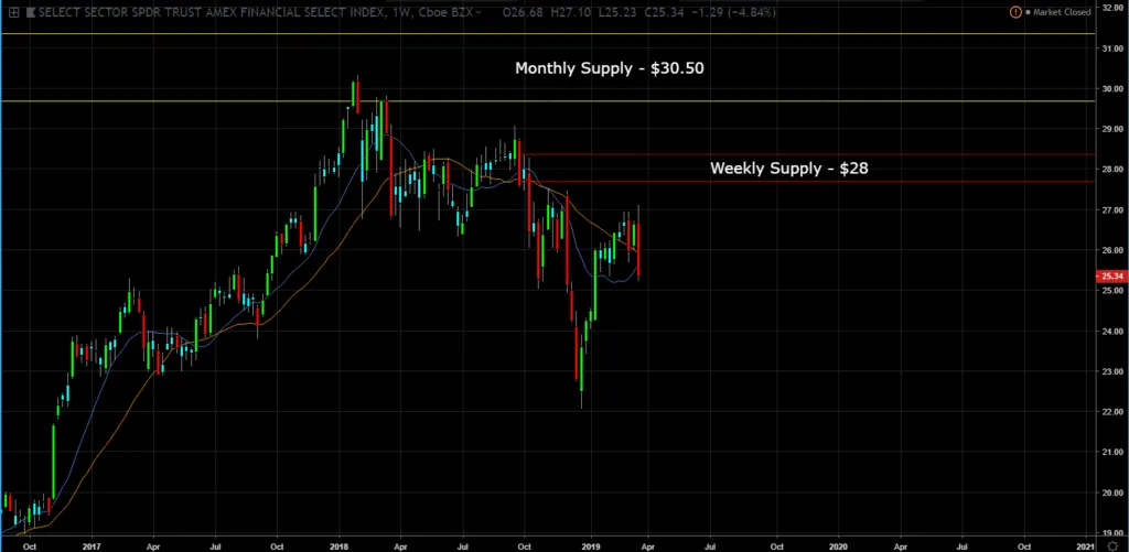 And when I look at the chart on the XLF, I don’t think the banks are fine. After hitting the monthly supply at $30.50 in January of 2018, price has just been trending lower.