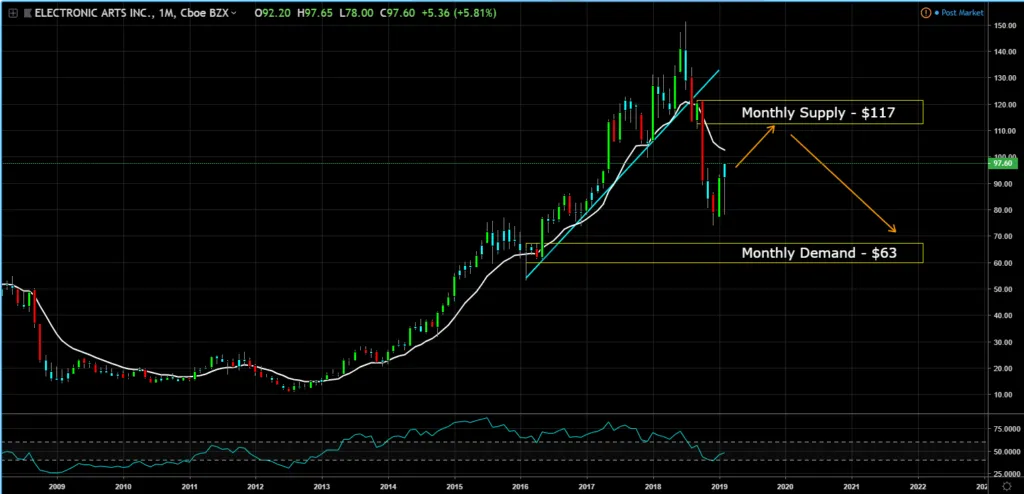 The chart suggests if EA can get to the monthly supply at $117, short it to the monthly demand at $63.
