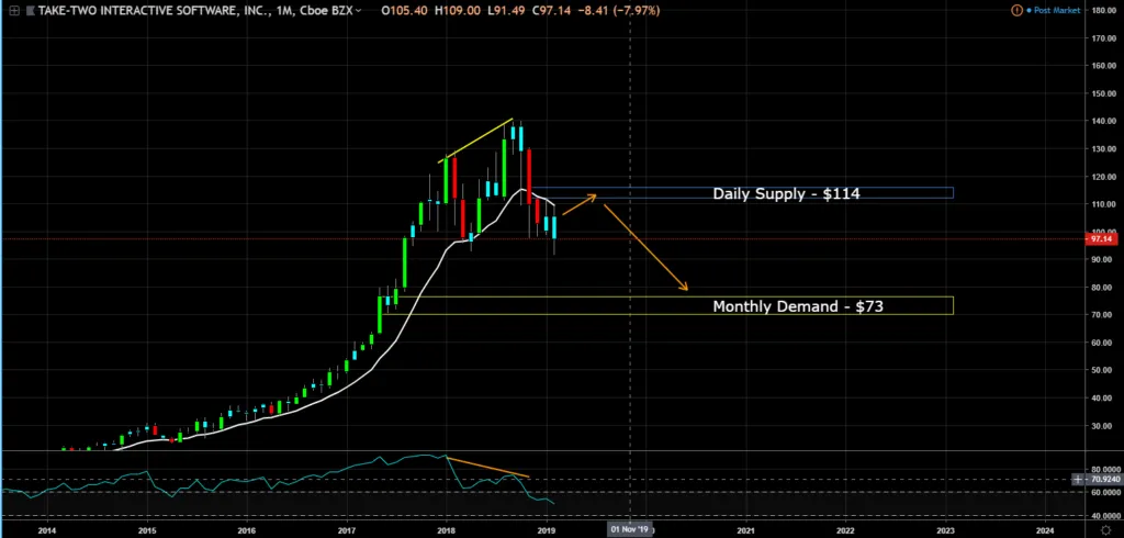 The chart suggests if Take Two can get to the daily supply at $114, short it to the monthly demand at $73.