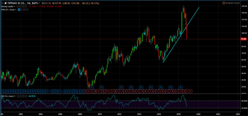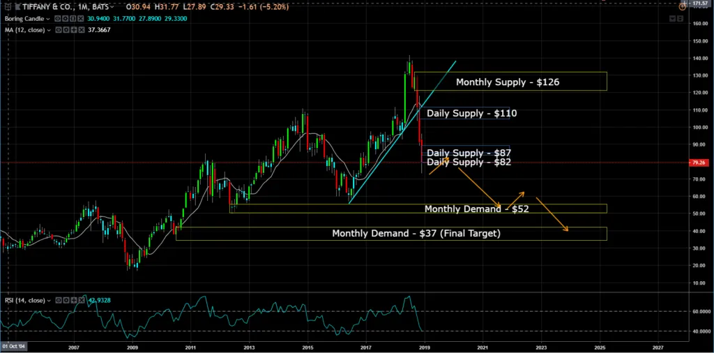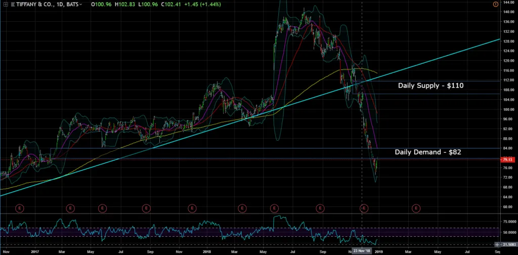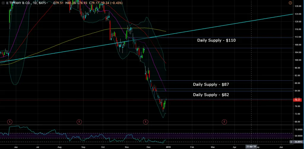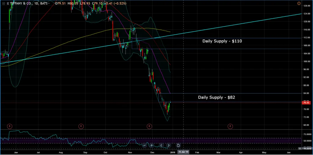 Last week, Tiffany stock price broke though the daily supply at $82.