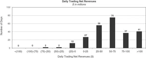 Goldman Sachs made $18.1 billion, or 53% of its revenue, from sales and trading in 2012, the company said today in its annual report. And it posted losses from trading on just 15 days last year, its best performance since the bank started disclosing that number in 2004. The distribution of Goldman’s daily trading profit is in the chart above.