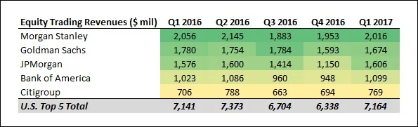 From 2016 into 2017, Morgan Stanley made more than $10 billion from equity trading. Morgan Stanley dominates the equity trading business, with the investment banking giant holding the top rank globally in 12 of the last 15 quarters.