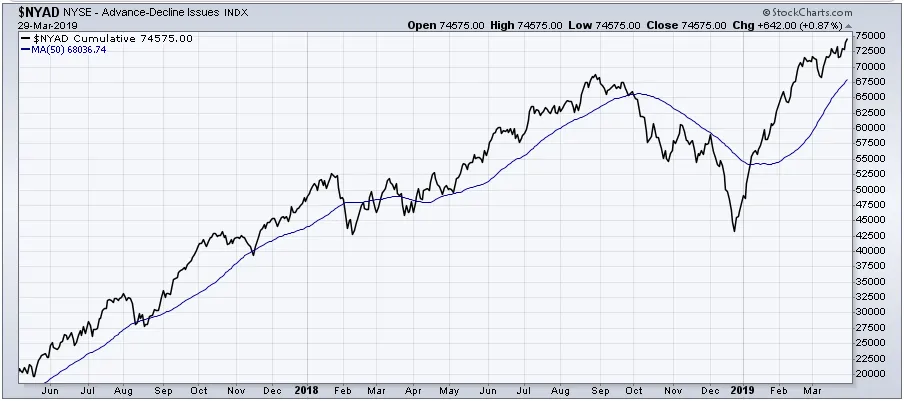 The advance/decline line (A/D) is a technical indicator that plots the difference between the number of advancing and declining stocks on a daily basis. The indicator is cumulative, with a positive number being added to the prior number, or if the number is negative it is subtracted from the prior number.