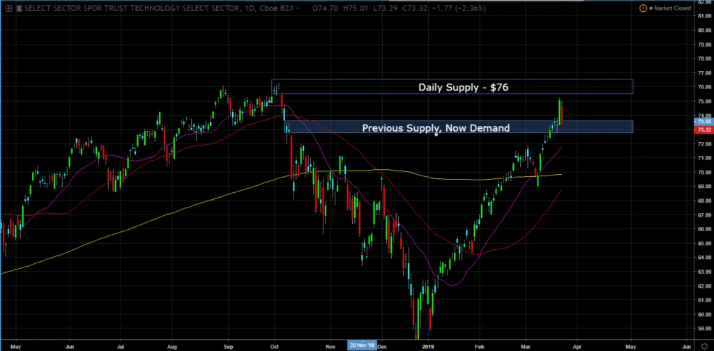 So the Information Tech SPDR ETF, XLK, price is wedged between previous supply, which is now support and the daily supply at $76.