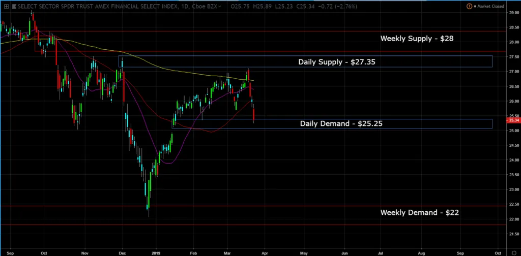 So the Financial SPDR ETF, XLF, price couldn't even make it back to the the daily supply at $27.35 and currently sitting in daily demand at $25.25.