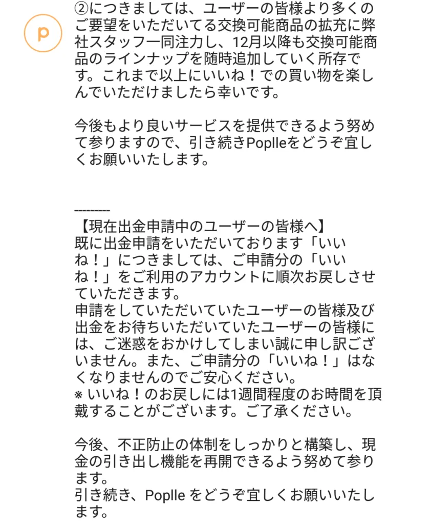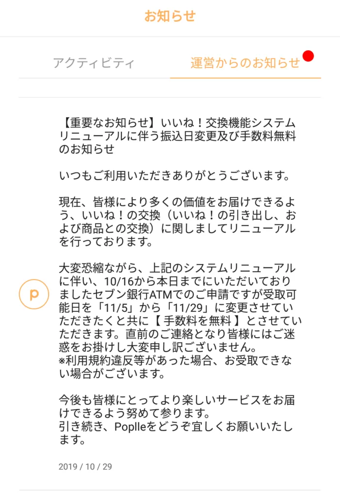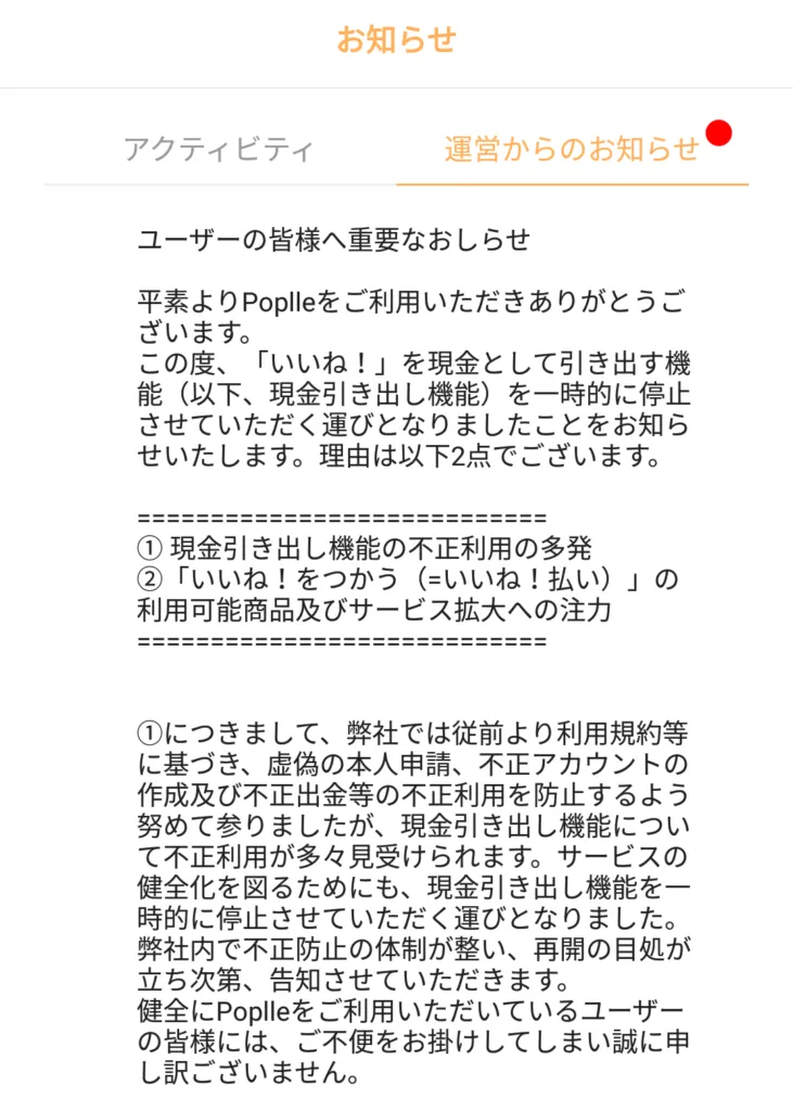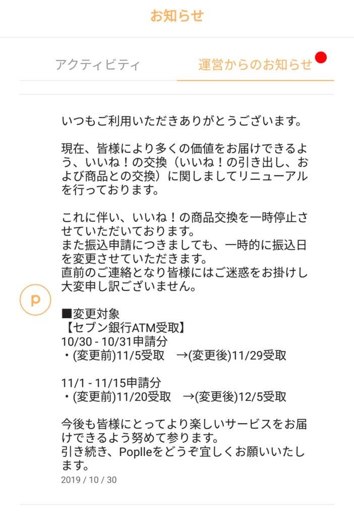 Poplleで現金引き出し機能の一時停止のお知らせが来ました。