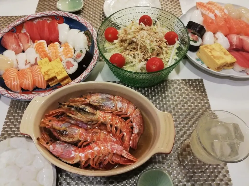 今日はコストコで手に入れたお寿司とエビを塩焼きにしてみました。あとはシメのお蕎麦を食べて終わりです。