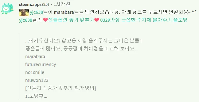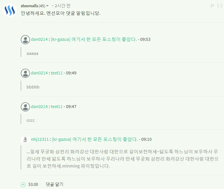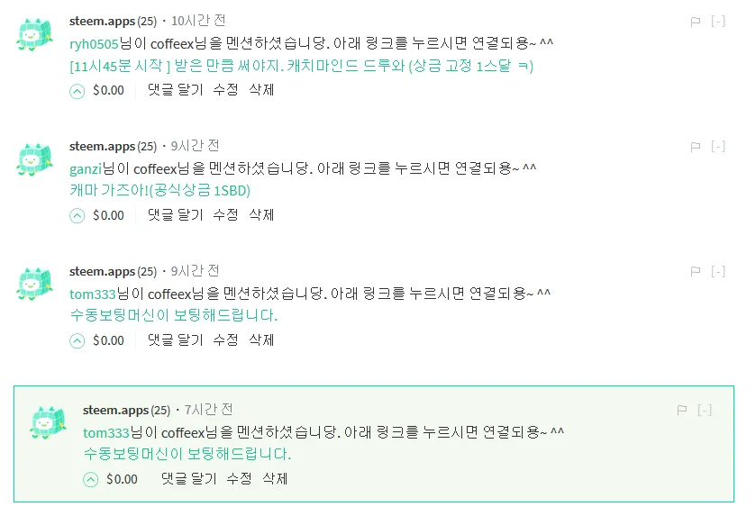 그래서 하루에 한번 내지 자기가 원하는 시간을 설정하여 모아서 댓글로 받아보실 수 있도록 했습니다. 하루에 한번 자기가 원하는 시간에 혹은 원하는 몇시간마다 댓글로 모아서 알려드립니다.