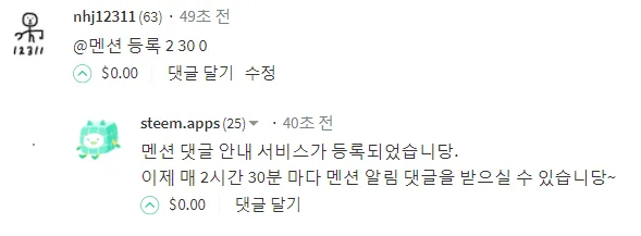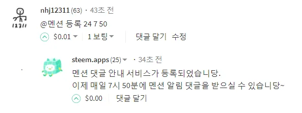 가령... 매일 아침 7시 50분에 댓글을 받고 싶다면 @멘션 등록 24 7 50으로 등록하면 되고...