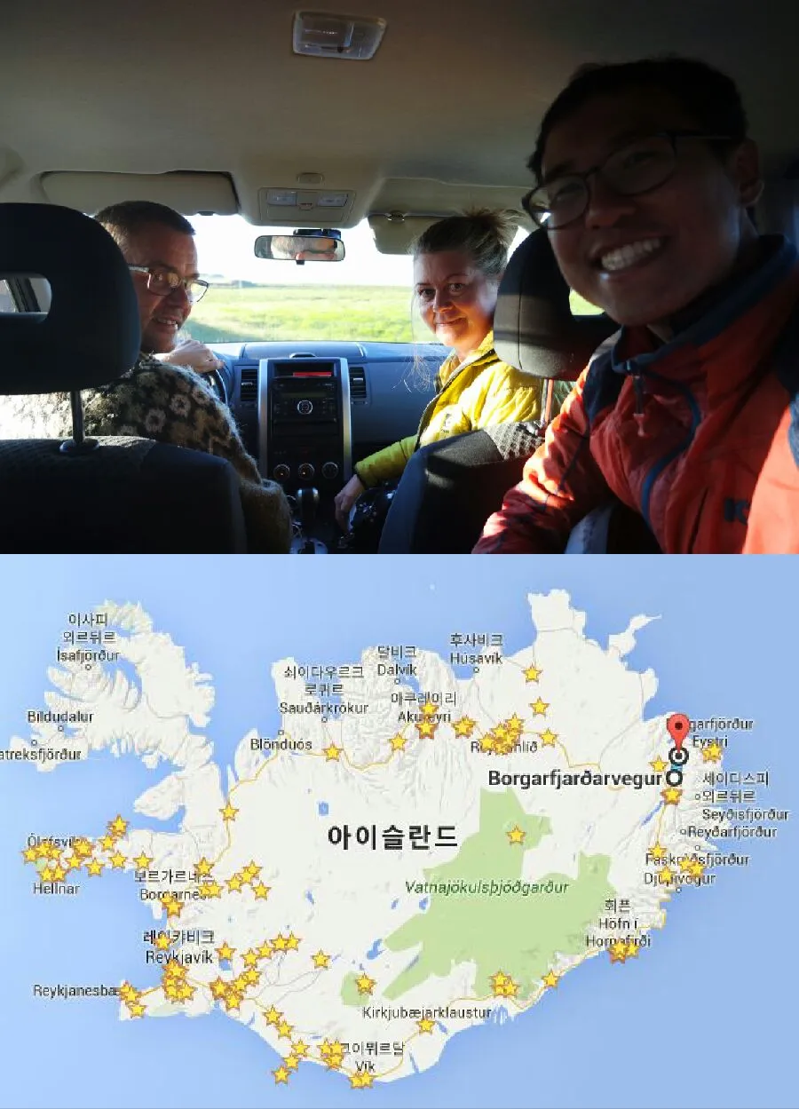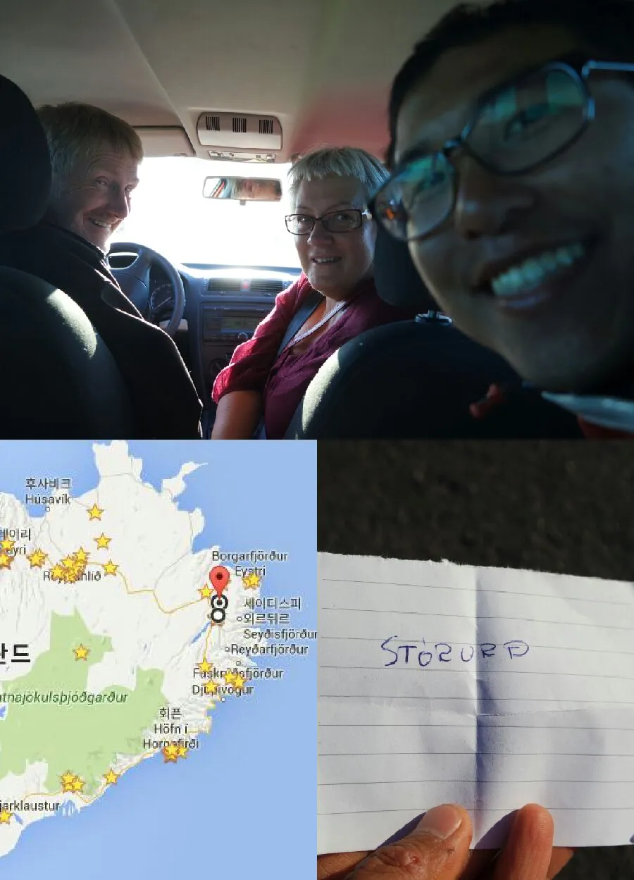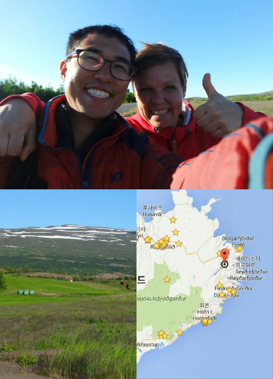 - 처음으로 히치하이킹으로 차를 잡고도, 뒷 차도 세워서 두 대의 차량 중에 어느 차가 더 멀리 가는지 물어보고 타는 히치하이킹을 하였다. 친절한 아이슬란드 사람들은 선뜻 내 사정을 이해하며 도와줬다.