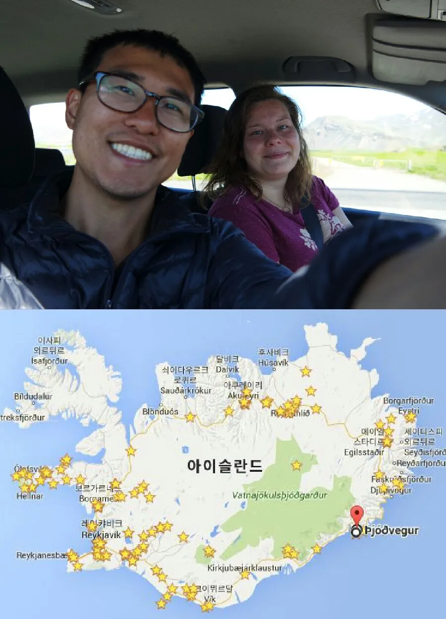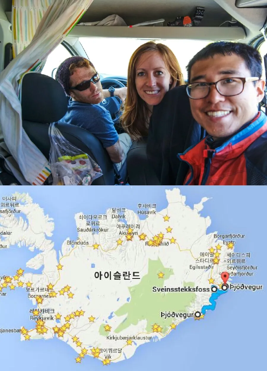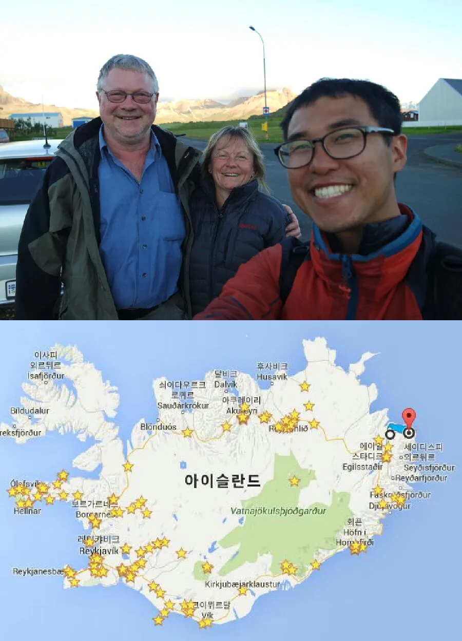 - 처음으로 히치하이킹으로 차를 잡고도, 뒷 차도 세워서 두 대의 차량 중에 어느 차가 더 멀리 가는지 물어보고 타는 히치하이킹을 하였다. 친절한 아이슬란드 사람들은 선뜻 내 사정을 이해하며 도와줬다.