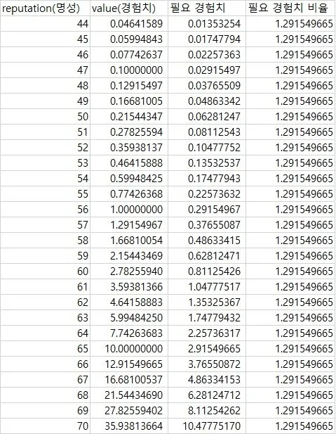 명성치를 1 올리기 위해서는 이전보다 1.29배의 노력을 해야한다.