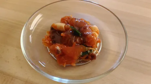 문어님, 퓨전으로 폴란드의 절여진 양배추님도 모셔왔습니다. 이제는 짬뽕 문어젓갈입니다. 원래 위대한 발명품은 짬뽕에서 시작하는 겁니다. 새콤하고 질감도 좋아서 인기가 많으신 분이에요.