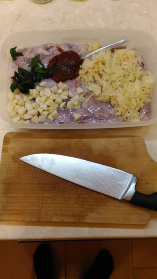 출연 : 문어, 파, 절인 마늘(최고의 재료!!!), 절여진 양배추, 고추장, 설탕 그리고 소금