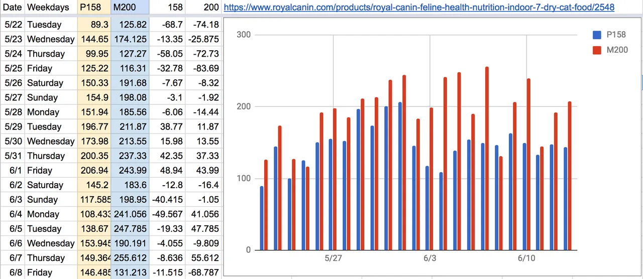 - 체중계 : 첫째는 마른 상태로 더 살이 빠지면 안 되고, 둘째는 비만이라 살을 빼야 해서 반려동물용 체중계를 구매했다. 첫째의 경우 4kg로 되돌리기 위해 1일 158kcal를 목표로 삼았는데, 둘째의 경우 180kcal부터 350kcal까지 웹사이트마다 다른 열량을 권고하고 있었다. 기존에는 230kcal를 목표로 급여하고 있었는데, 지난 7일간의 평균 섭취 열량이 196kcal인 반면 몸무게는 큰 변화가 없어 200kcal를 섭취하는 것으로 재조정했다.