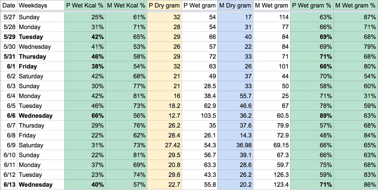 습사료 대비 건사료의 열량이 2~9배 정도 높기 때문에 열량을 채우면서도 토하지 않을 만큼 먹이기 위해서는 적당량의 건사료 급여가 필요하다. 문제는 어느 정도의 양이 적당한 것인가였다. 결국 전체 먹은 양 대비 습사료 비중을 계산해 보았고, 혼자 배변을 한 날은 굵은 글씨로 표시를 해서 대조한 후, 매일 먹는 양의 70%는 습사료를 먹이기로 했다.