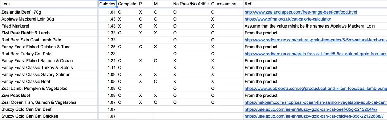 닭, 치즈, 생선까지만 허용하는 첫째와는 달리 둘째는 소, 캥거루, 사슴도 먹는다. 둘 다 양고기와 칠면조는 싫어하는 것으로 보인다. 문제는 일일 섭취 칼로리인데 1g당 적어도 3.5kcal를 생성하는 건사료와 달리 습식 캔은 1g당 0.4kcal~1.6kcal밖에 되지 않는다. 그 때문에 습식 캔만 먹을 경우 건 사료 섭취의 3배에 달하는 양을 먹어야 하는데, 이제까지 건 사료 위주로 먹었던 첫째 둘째의 위는 그렇게 크지 않다. 한 번에 많이 먹지도 않지만, 혹시나 많이 먹은 경우에는 결국 토해내기 때문에 우리는 잘 먹으면서도 열량이 높은 그러면서도 방부제와 인공 향료도 없으며, 뉴질랜드산 녹색 잎 홍합이 들어가 관절에도 도움이 될 주식 캔을 찾고 있다.