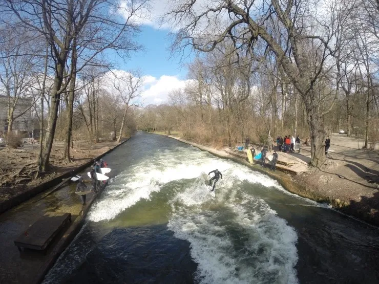 공원에 가면 뮌휀에서만 볼 수 있는게 또 있는데요. 바로 급류를 타고 서핑을 즐기는 사람들이죠. 그냥 천인데 물살이 왜 이렇게 쎈 지는 잘 모르겠는데, 여기서는 시내 천에서 서핑을 볼 수 있어요.