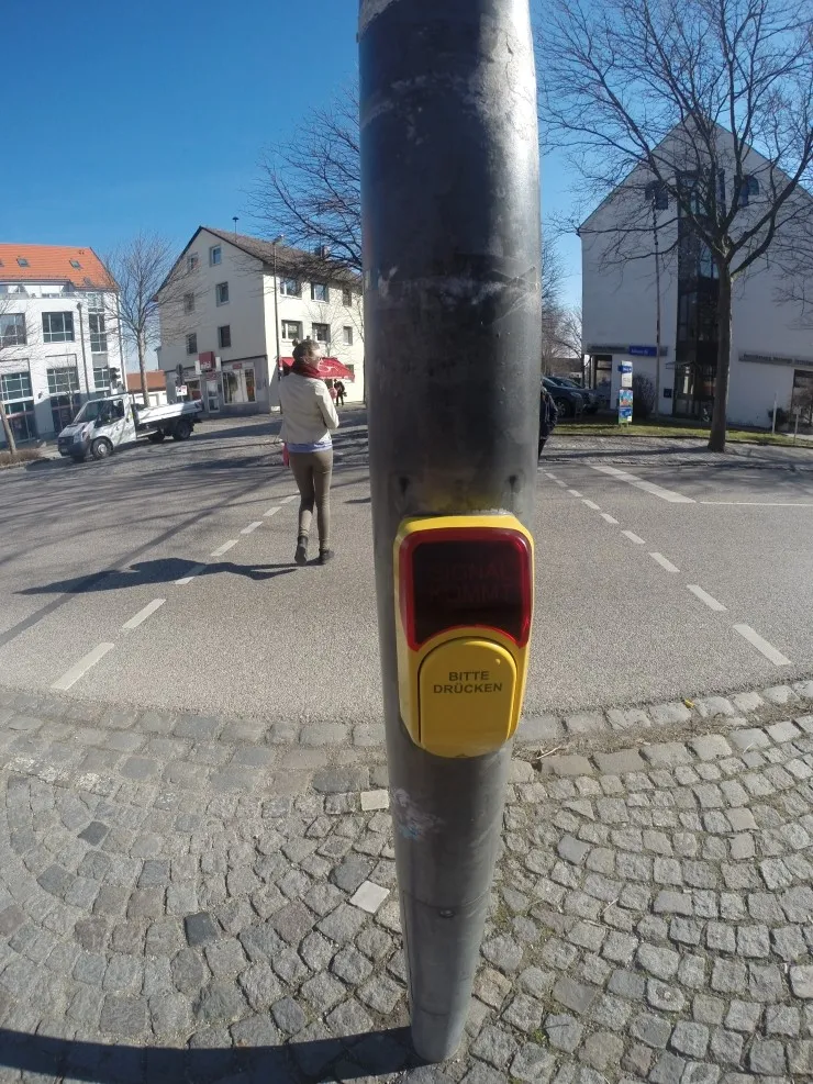 횡단보도 스위치입니다. 횡단보도를 건너려면 스위치를 누르고 기다려야 해요. 스위스에서도 보기는 했지만, 독일에서도 당시에는 한국 생활에 익숙해서 스위치 안 누르고 3분, 5분 기다리기도 했던 것 같아요. 지금은 잘 누르고 다닙니다. 여기 지금 제가 살고 있는 폴란드에서는 횡단보도 스위치에서 소리가 나서, 안 누를 수 없는 것 같아요 ㅎㅎㅎ