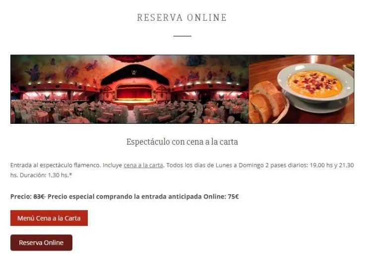 공연시간이 1시간 반으로 긴 반면, 다양한 레파토리를 가져서 덜 지루하다는 평이 있습니다. 사진 및 동영상 촬영이 허용됩니다! 좌석은 음료 포함인 경우, 무대 바로 앞에서 관람하게 되고, 그 뒤쪽으로 타파스나 저녁을 포함한 객석이 있습니다.