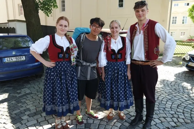 체코에서 가장 아름다운 '크베르나 정원'으로 향하는 길이었는데요. 몇몇의 무리들이 체코 전통 의상을 입고 대기하고 있더라고요. 알고보니 여기 정원이 아름다워서 자주 결혼식이 열린다고 해요. 이들은 신랑, 신부를 위한 손님이였어요. 기억으로 남기기 위해 같이 사진 찰칵! 어휴 남자애가 키도 크고 잘 생겼네요. 남자친구 없으신 분?!