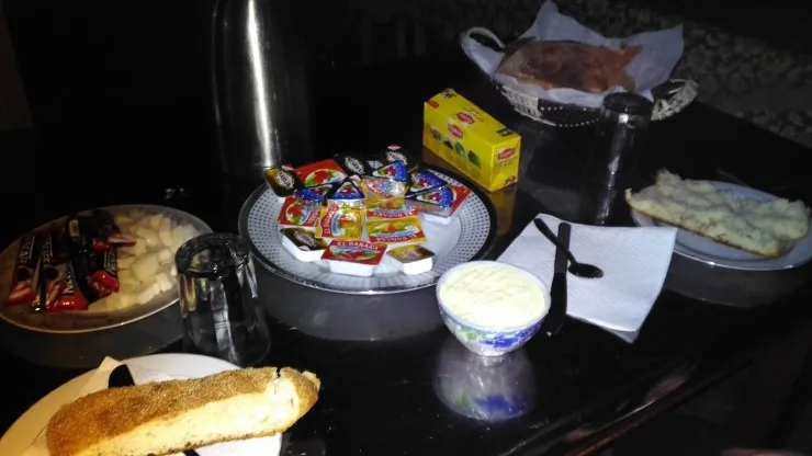 텐트에 필요 없는 짐들을 놔두고(옷 같은 것) 쉘터로 가서 아침을 먹었습니다. 저희가 준비해 온 식량이 얼마 안되어서 한 사람당 70디르함(7유로)를 내고 먹었어요. 좋은 것은 빵이 무제한이라는 점이랑 큐브 치즈와, 버터, 잼이 많이 나온다는 것입니다. 배불리 먹고 비상시를 대비해서 버터 빵, 딸기잼 빵, 살구잼 빵, 치즈 빵 등 8개 정도를 만들고도, 치즈랑 잼이 남아서 쉘터에 빵을 조금 더 달라고 해서 더 만들었습니다.