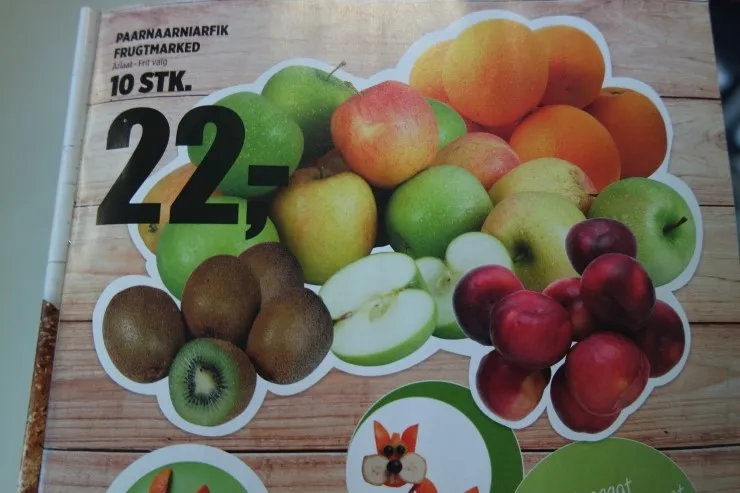 먼저 과일을 보러 갔는데요. 사진에서 보다시피 사과, 키위, 오렌지 다 해당이 된답니다. 10개에 22크로네이니까(3740원), 1개당 374원 하는 셈이에요! 관광화 된 도시 일루리샤트였다면, 사과 하나에 1000원이었을텐데, 여기 누크에서는 이 정도면 과일 비싸기로 유명한 한국보다는 저렴하지 않은가요?ㅎㅎ
