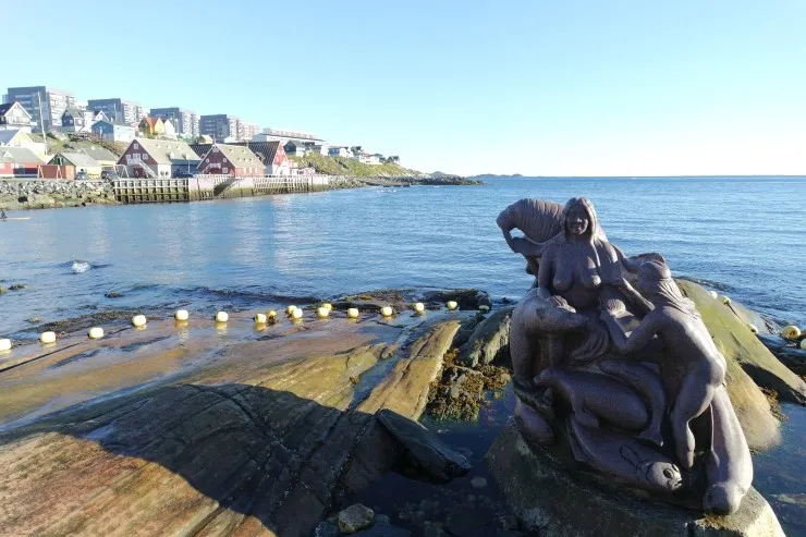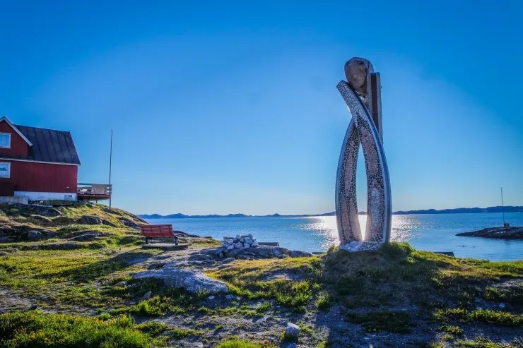 가는 길에 누크의 멋진 조각상을 볼 수 있었어요. 무슨 의미가 있는지는 잘 모르겠는데, 햇살이 바다 위로 뿌려져 기둥을 비추길래 후광이 나는 것처럼 사진을 찍어봤어요.