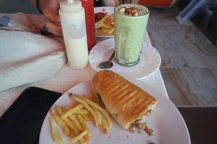 다음 날 아침, 야영을 끝내고 셔틀버스를 타고 초입 마을인 Awrir로 나와서 아침을 먹었어요. 메뉴는 닭고기 샌드위치와 아보카도 주스!!! 아보카도 주스가 1400원인가 했는데 진짜 맛있었어요. 위에 견과류도 좀 뿌려서 주고, 아보카도와 견과류의 만남은 또 색다르더군요!