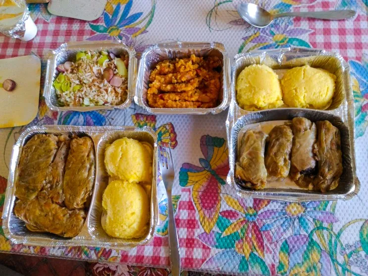 먼저 노란 것은 마마링가라고 해서, 계란 같은 걸로 만든 디저트인 줄 알았는데, 밀가루랑 무언가로 만든 밥 대신 먹는 것!! 이 정도로 묘사가 가능하겠네요. 맛은 사실 별로 없었습니다. 그 옆쪽으로는 사르말레라고 하는데요. 터키나 불가리아의 살마, 돌마와 같은 것입니다. 다진 고기와 다진 양파 등을 잎파리에 말아서 끓여 요리한 것인데요. 이게 맛있는 곳은 진짜 엄청 맛있습니다. 터키에서 이거 엄청 먹다가 식도염 걸려서 병원에 갔는데, 수면 내시경하는데 260달러 라고 해서... 한국 왔어요 ㅋㅋㅋ