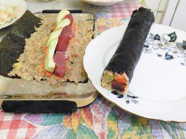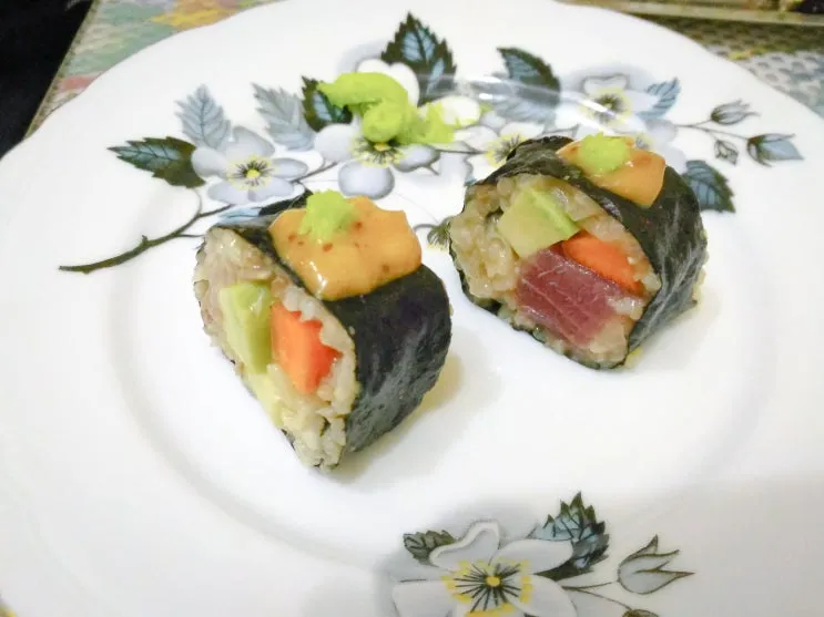 그렇게 아보카도와 당근을 넣고, 누런 스시 완성!!