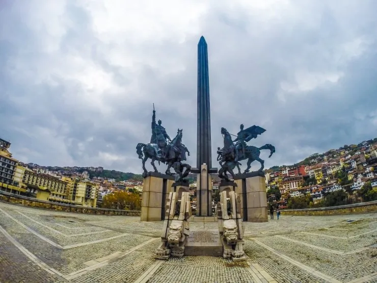 굽이치는 천 가운데에는 조각상이 있는데요. 크기는 10층 빌딩 정도 높이로 생각보다 거대한 조각상이였어요. 말을 탄 4명의 기사들 사이에는 검으로 보이는 조각품이 있었는데, 옛 불가리아의 영광을 재현하려고 한 느낌이에요.